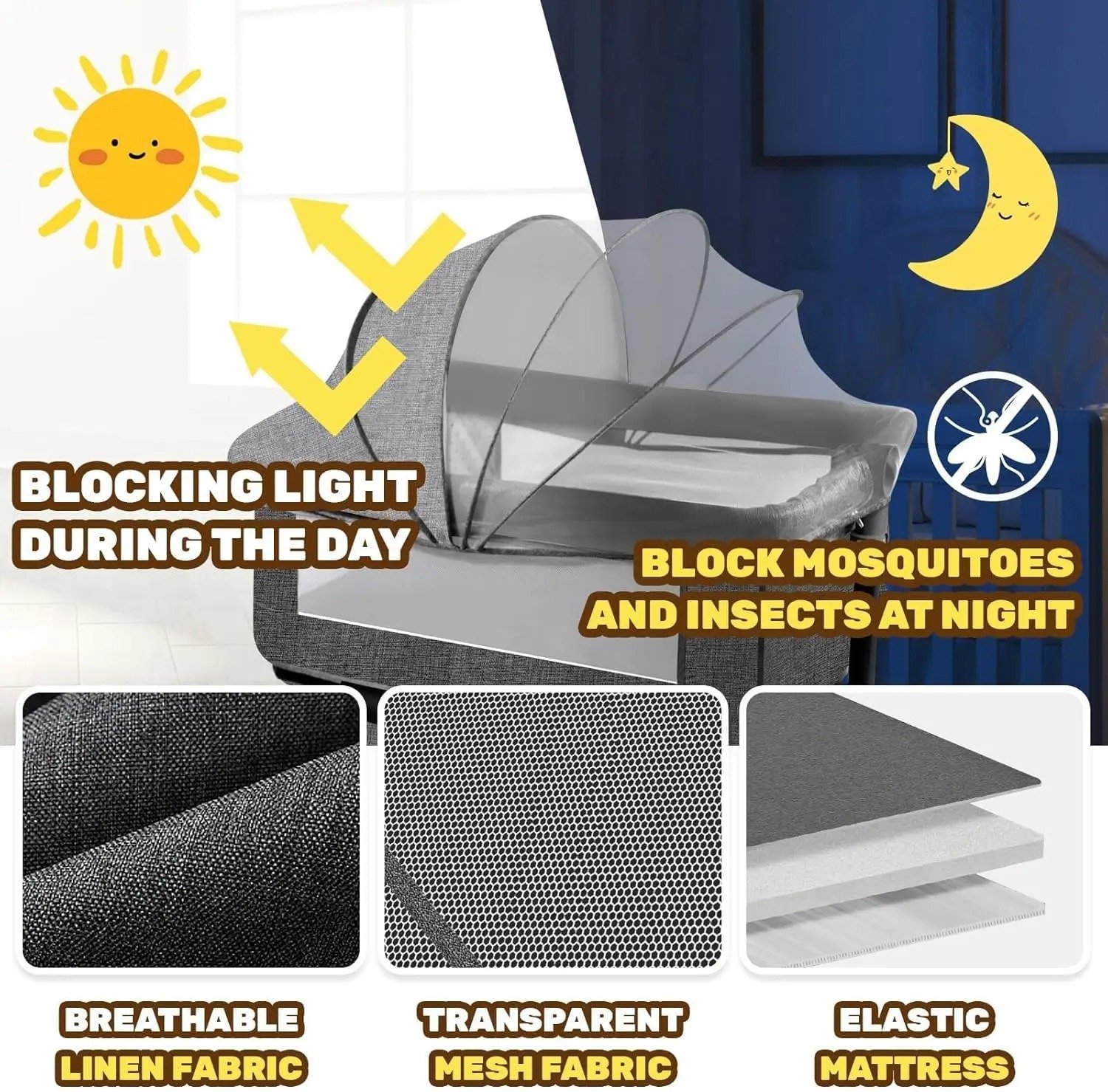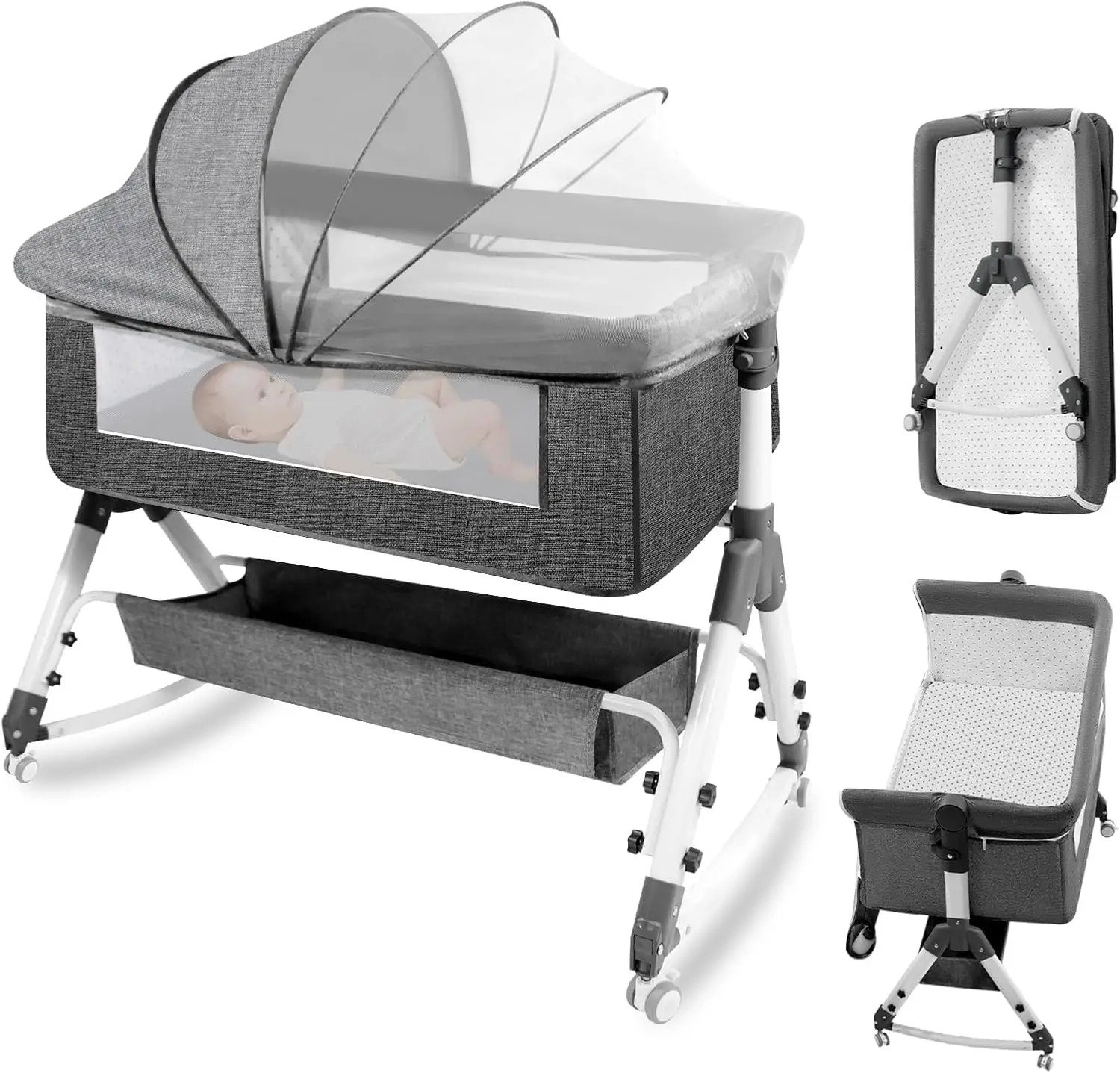 سرير أطفال بجانب السرير – قابل للطي مع تخزين وناموسية